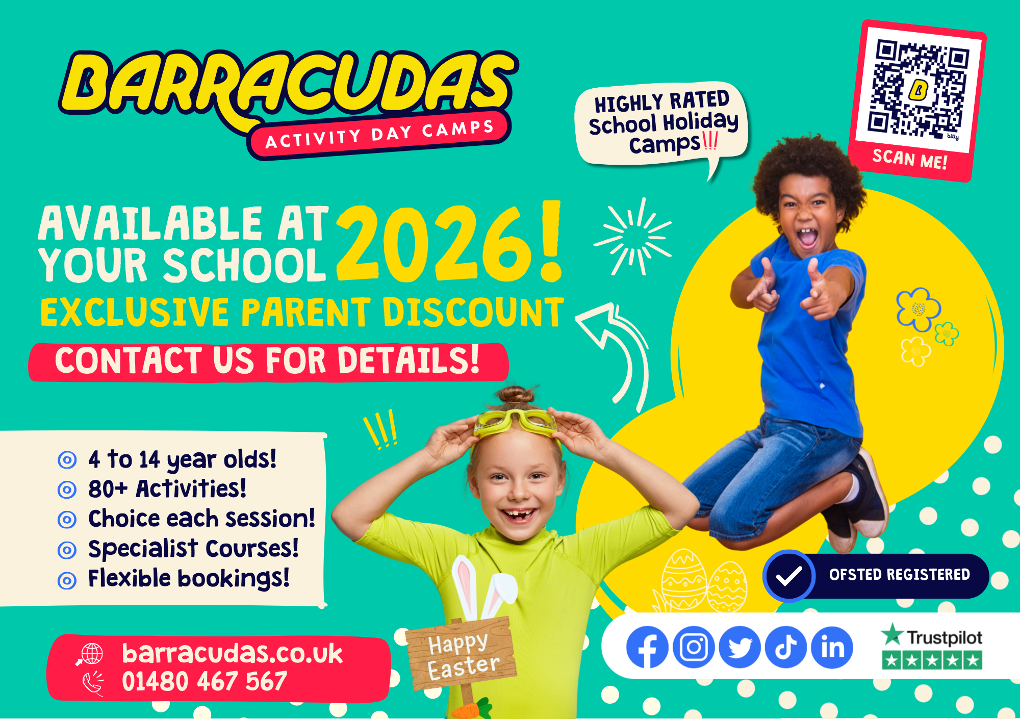 Barracudas, the UK’s favourite holiday camp for children aged 4 to 14, will be running at our school this Easter and Summer!