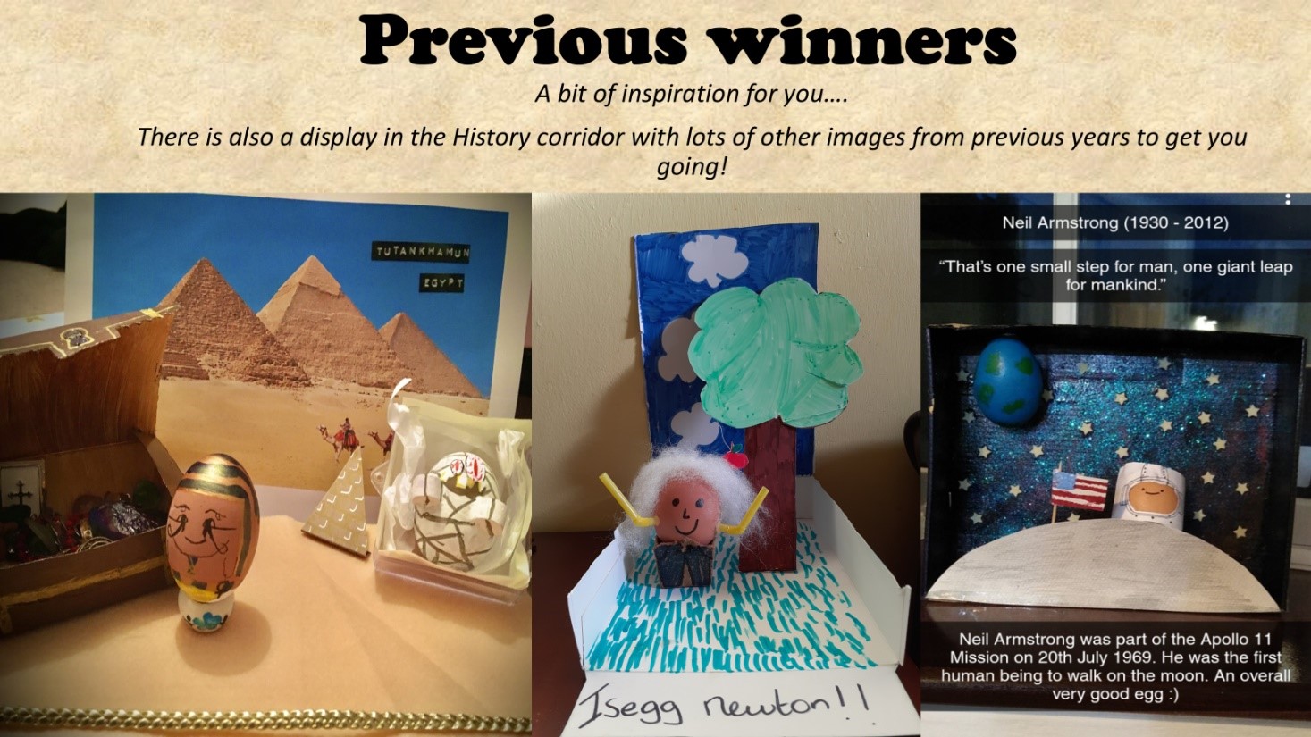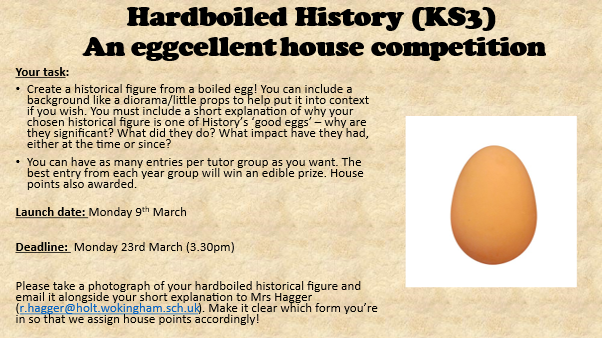 To end the round up of department news…….the history department have just launched their annual Easter competition- my personal favourite- Hard Boiled Histories