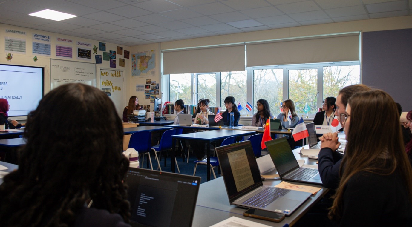 Dividing into three separate sections of the MUN, Holt Students led the actions of resolution writing, lobbying, collaboration and discussion, to try and reach an agreement on pressing international matters. Alicia and Alolika headed up the General Assembly considering the ‘Safeguarding of Education in Sudanese Conflict Zones’. Nada and Eliana led on ‘Addressing the socioeconomic challenges of climate-induced displacement’ in ECOSOC. Finally, Lilia and Isabelle, ‘Addressing North Korea’s use of AI and it’s impacts on international peace and security’. The resources had been considered and prepared in advance, shared with all delegates a week before. After their initial country opening speeches, the debates ensued.